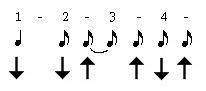 Ritmul de astazi, este foarte asemanator cu cel din lectia trecuta. Aici, observam ca pe timpul intai, avem doar bataie in jos, iar in sus trecem cu degetele pe deasupra corzilor. Atentie, miscarea mainii trebuie sa fie mai mult din incheietura, nu din antebrat. Astfel, mana dreapta trebuie sa fie cat mai relaxata. Restul ritmului este absolut identic. Daca veti incerca acest ritm, veti observa chiar ca este un pic mai usor decat cel din lectia trecuta, datorita acestor doua pauze din cadrul sau. Ca de obicei, trebuie sa il exersam mai intai la o viteza lenta si fara schimbari de acorduri, apoi din ce in ce mai repede, pentru ca la final sa folosim si schimbari de acorduri. Acestea fiind spuse, o sa trecem la partea de cantece a lectiei, in care vom aplica cele invatate mai sus.