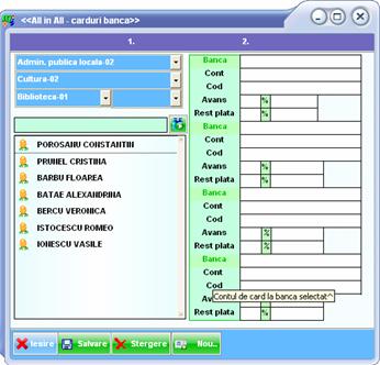La fiecare angajat se completeaza in rubricile aferente bancii la care are cont/card datele necesare (numar cont, numar card, avans, rest plata). Avansul si restul de plata pot fi completate ca procent sau suma fixa.