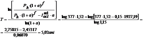 Exemplu: in cazul aplicatiei de realizare a unui sistem tehnico-economic cu specific de productie ce va realiza subansambluri auto, pentru care s-au prezentat indicatorii de eficienta economica a investitiei in tabelul 3.3, dar in forma statica, se calculeaza randamentul economic si termenul de recuperare actualizati, la momentul luarii deciziei de investitii. Se considera o rata de actualizare a = 15% si o perioada afectata proiectarii de 1 an se adauga perioadei de realizare a obiectivului. Calculele se realizeaza doar pentru varianta V1 de proiect.