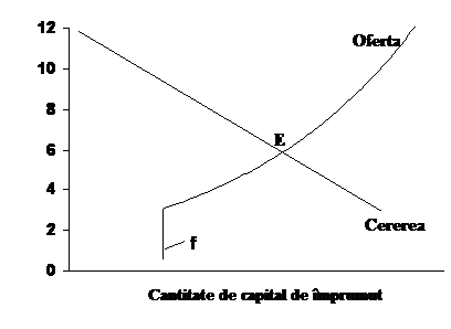 La intersectia curbelor cererii si ofertei apare punctul de echilibru E, care pune in evidenta nivelul ratei dobanzii (figura nr. 45). De asemenea, din grafic, putem observa de la ce nivel sunt dispusi posesorii de capital de imprumut sa ofere capitalurile lor.