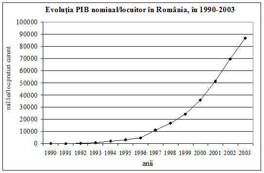 In tara noastra, in perioada 1990-2003, PIB in valori nominale, preturi curente ale fiecarui an, a cunoscut urmatoarea evolutie, prezentata in Tabelul 2.1, in care valoarea PIB incepand cu 1998 este prezentata conform metodologiei SEC 95. Cei doi indicatori PIB nominal si PIB nominal/locuitor sunt prezentati in graficul din Figura 2.1 si Figura 2.2, prezentand o evolutie ascendenta, puternic crescatoare.