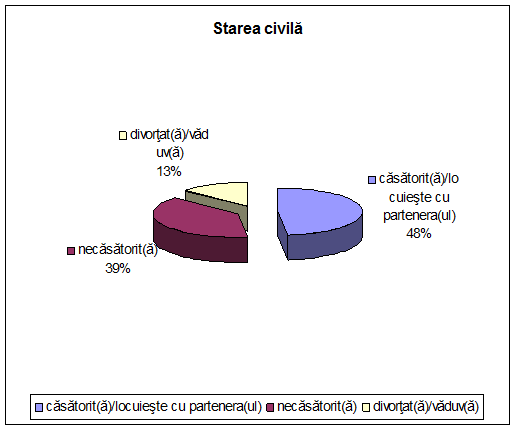 Cea mai mare pondere in randul persoanelor intervievate o reprezinta persoanele necasatorite cu un procent de 48%, persoanele casatorite si cei care locuiesc cu partenerul au insumat u procent de 39%, iar cele divortate sau vaduve 13%.