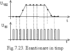 esantionarea in timp real - se aplica semnalelor de frecventa relativ joasa si celor tranzitorii, deci in situatii in care esantionarea in timp echivalent presupune un timp prea lung sau nu este aplicabila (datorita neperiodicitatii semnalului). Ea se desfasoara dupa principiul ilustrat in fig.23.