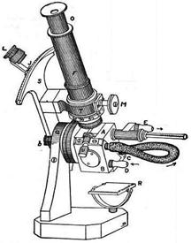 La refractometrul Abb luneta (O) de observatie este fixa. Se poate, in schimb, roti blocul de prisme pana ce in luneta se poate vedea o linie de separatie neta lumina intuneric.