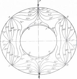 Tinand seama si de conditiile po contur, se obtin elemente suficiente pentru trasarea aproximativa a curbelor σ1 si σ2, care se corecteaza apoi verificand indeplinirea simultana a conditiilor date de relatiile (67), (68). Asa cum s-a aratat, pe un contur neincarcat se pot separa tensiunile principale, una din tensiuni (cea normala la contur) fiind nula. In aceste puncte se poate determina si unghiul y dintre axa de simetrie si tangenta la curba de variatie a tensiunii principale normala la contur.