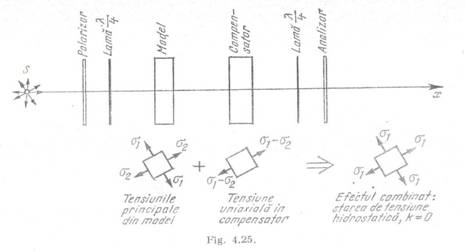 Functionarea compensatorului cu epruveta de tractiuue se bazeaza pe faptul ca o stare plana de tensiune poate fi descompusa intr-o stare de tensiune hidrostatica si o stare de tensiune uniaxiala, asa cum rezulta din fig. 2 Dupa cum s-a aratat, starea de tensiune hidrostatica σl- σ2 = 0, corespunde ordinului de banda zero, in timp ce starea. de tensiune uniaxiala corespunde unei valori oarecare a ordinului de banda.