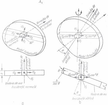 Considerind tensiunea principala σ3 = 0, se roteste modelul fotoelastic cu unghiul Φ in jurul directiei tensiunii principale σ1 (fig. 47).Lungimea drumului parcurs de lumina prin model in acest caz va fi h/cosΦ, iar tensiunile principale din planul principal pe directia de propagare a luminii sint σ1si σ cos2 Φ. Inlocuind aceste valori in expresia (78) si notind cu k ordinul de banda, determinat in acelasi punct P, prin incidenta oblica , se obtine: