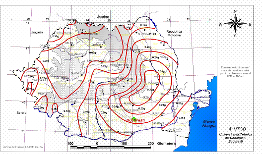 Pentru proiectarea antiseismica constructiilor exista harti speciale, cum este cea prezentata in fig. 2.b., preluata din Codul P.100-1/2006, care reda zonarea teritoriului Romaniei in termeni de valoare de varf a acceleratiei orizontale a terenului.