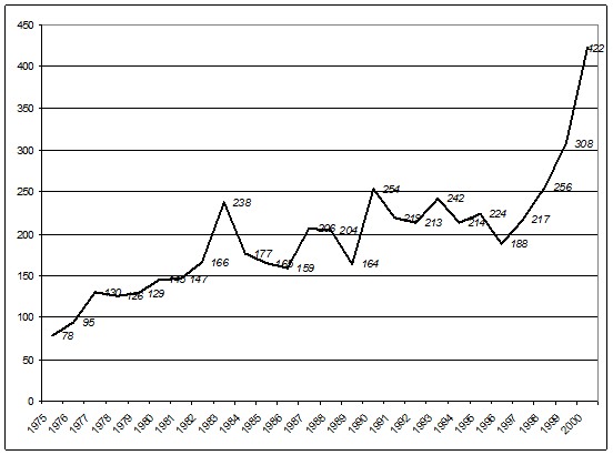 Fig. 1. Numarul total al dezastrelor naturale pe glob (1975-2000)