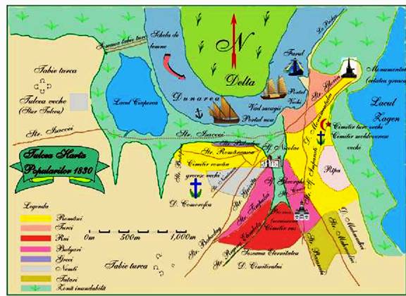 Cedarea Deltei catre Rusia prin pacea de la Adrianopol (1829) a determinat o alta miscare de populatie catre Tulcea "reprezentata foarte bine in Tulcea, harta popularii dupa 1830" intocmita de Gh. Bratescu in 1928, se indica extinderea asezarii la aceea perioada, sugerand totodata directiile principale de extindere prin aportul succesiv al populatiilor. Dupa 1830, pana in 1856, Tulcea s-a extins dinspre Est spre Vest, si anume venirea in marea lor majoritate a locuitorilor din satele Bestepe moldoveneasca, Prislav (Nufaru de astazi), Bestepe turceasca (azi Bestepe), Dunavat.