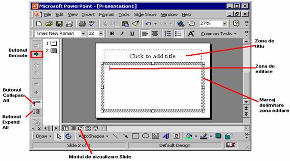 Panoul Outline iti asigura cel mai usor mod de editare. Executi clic in structura slide-ului pentru a muta indicatorul mouse-ului acolo unde doresti sa editezi (in zona de titlu sau in cea de continut, imediat langa numarul slide-ului) si apoi introduci textul de la tastatura. Poti sa redimensionezi fereastra de editare cu ajutorul barei de dimensionare, in functie de lungimea textului.