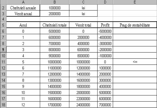 Pentru a determina pragul de rentabilitate (anul in care venitul total depaseste cheltuielile totale), in celula E6 se introduce formula: