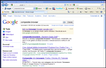 Ceea ce se incarca in browser este pagina de pornire (denumita si pagina de start) a versiunii in limba romana, a motorului de cautare Google. In partea de sus a paginii de start, in casuta text "Cautare", introduceti comparatie browser. Rezultatul cautarii in paginile google dupa cuvintele de mai sus este reprezentat in imaginea urmatoare.