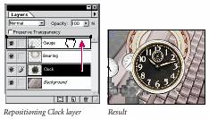 2. Clicati pe stratul Clock si trageti-l in sus pentru a-l pozitiona in partea de sus a paletei. Cand observati o linie groasa deasupra stratului ce contine instrumentul de masura - ceasul (gauge), eliberati butonul mousului. Stratul cu ceas se muta in partea de sus a stivei de straturi din paleta, iar imaginea ceasului apare deasupra tuturor imaginilor.