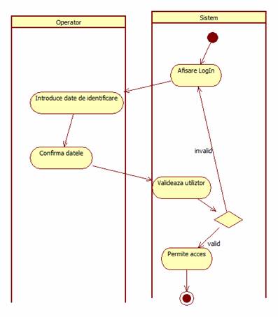 Utilizatorul furnizeaza numele de utilizator si parola. Sistemul verifica corectitudinea datelor. Utilizatorul este autentificat si este permis accesul. |
