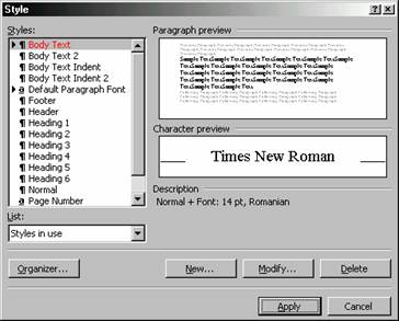 Stilurile Character, se aplica oricarui text selectat si pot contine orice atribut de formatare care se refera la caractere individuale: denumirea si marimea fontului, sublinierea, tipul (orice atribut de formatare pe care il puteti atribui selectand optiunea Font din meniul Format). Nu exista un stil prestabilit pentru caractere.