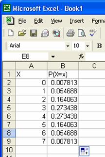 X este evenimentul de a selecta o femeie. Se fac 7 selectii si exista 8 posibilitati: de a selecta 0,1, . ,7 femei. Fiecare posibilitate are o probabilitate pe care o vom calcula in coloana B.