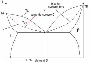 Temperatura de curgere zero (Tco) la care inceteaza curgerea unui aliaj, corespunde unei fractii de 20 30% de faza solida in masa aliajului. Pozitia curbei temperaturii de fluiditate zero (Tco) in raport cu intervalul de solidificare este aratata in figura 1.29 pentru un sistem de aliaje care formeaza eutectic.