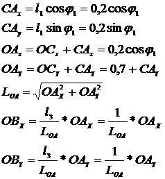 Se considera sistemul de axe cu originea in articulatia din O. Proiectiile pe axe ale barelor mecanismului determina coordonatele punctelor A si B.