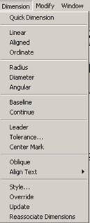 Comenzile de cotare se pot alege din bara mobila cu instrumente Dimension, din meniul derulant Dimension sau se pot scrie la tastatura.
