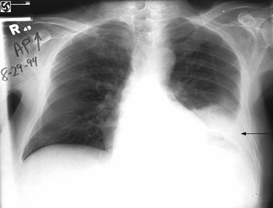 Pe masura ce lichidul se acumuleaza, pe radiografia toracica de fata opacitatea bazala determinata de lichid este limitata superior de o linie concava superior si intern, denumita linia Iui Damoiseau. In acumularile masive de lichid se observa o impingere progresiva a mediastinului. Atractia mediastinului poate fi prezenta in cazurile de tumori pulmonare in lobii inferiori care "fixeaza mediastinul'