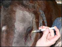 se introduce apoi o mesa de tifon de 30-40 cm, imbibata cu sulfatiazol 20% sau eter iodoformat 10%, care va servi ca dren si din care se va extrage zilnic o portiune, rana suturandu-se in puncte separete,