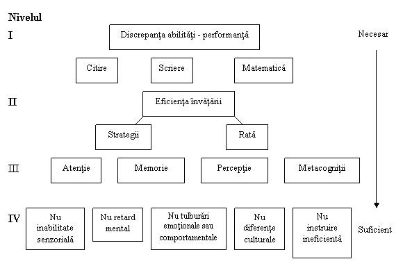 Modelul lui Kavale si Forness indica etapele prin care un elev poate fi identificat cu LD, dar permite si intelegerea naturii LD (vezi figura 5). Acest model are mai multe niveluri ce vor fi prezentate in continuare: