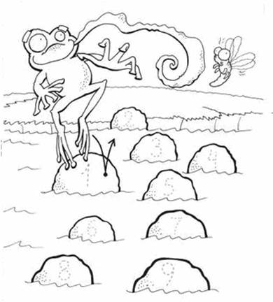 Ajuta broscuta sa sara din piatra in piatra pana la mal. Noteaza fiecare piatra si numara in ordine crescatoare si apoi descrescator, cand broscuta se intoarce de unde a plecat