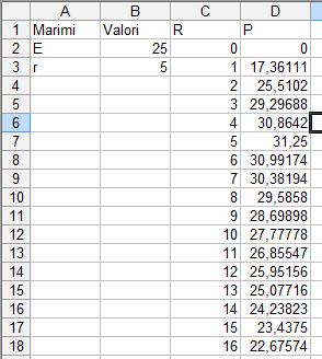 3. Pe coloana D se scriu valorile lui P conform formulei indicata pe pagina precedenta. Astfel la D2 scriem formula =C2*$B$2^2/($B$3+C2)^2 pe care o prelungim prin tragere cu mausul pe toata coloana. Partea superioara a tabelului trebuie sa arate ca in figura de mai jos