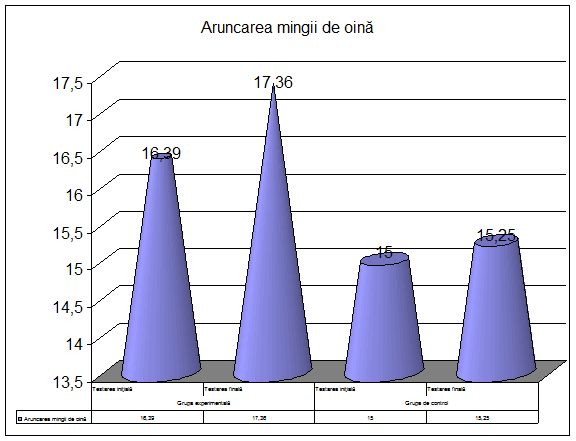 3. La testarea initiala rezultatele obtinute de componentii celor doua grupe sunt relativ egale, lucru scos in evidenta de valorile apropiate ale mediei aritmetice, pentru ca la testarea finala performantele obtinute sa fie net superioare pentru elevii din grupa experimentala.