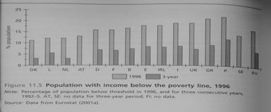 intre tari, ea indica starea de extrema saracie din respectiva tara. Folosind aceasta masura, 18 procente din persoanele din UE, sau mai mult de una din sase, are un venit sub nivelul de saracie, in 1996 (a se vedea Tabelul 3).