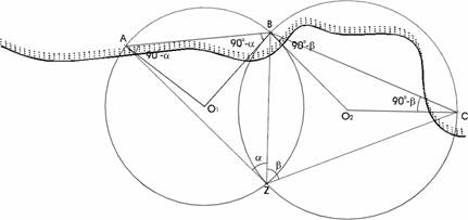 Presupunand ca observatiile sunt simultane, punctul navei se obtine prin trasarea arcelor de cerc capabile de unghiurile α si β (fig. 4), care se construiesc pe harta. La intersectia celor doua arce de cerc se afla punctul observat al navei Z.